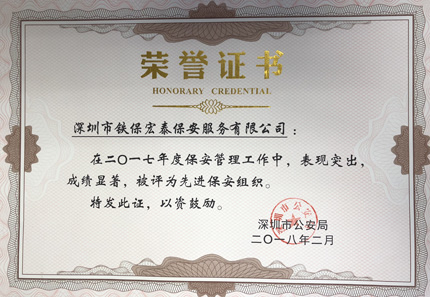 祝賀我司在2017年度保安管理工作中,表現(xiàn)突出,成績顯著,被深圳市公安局評為先進保安組織。